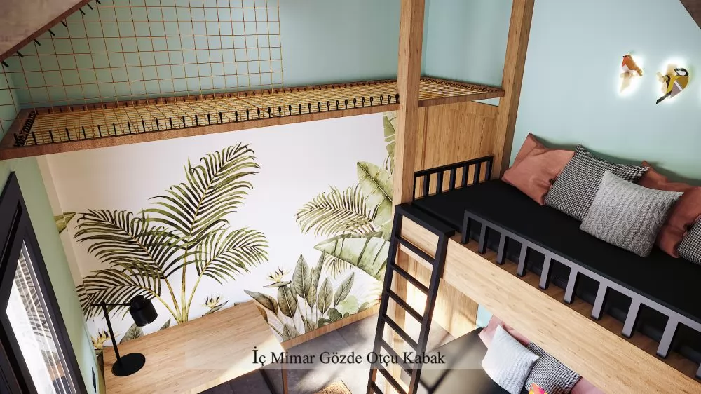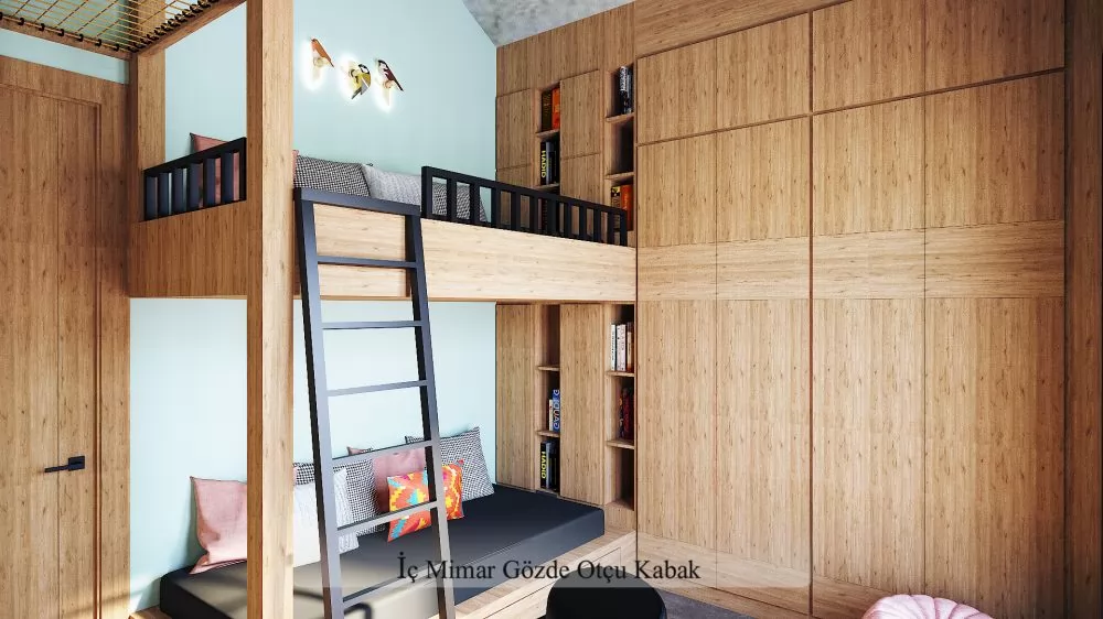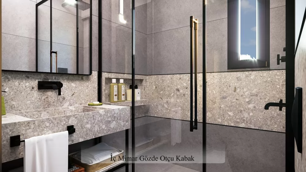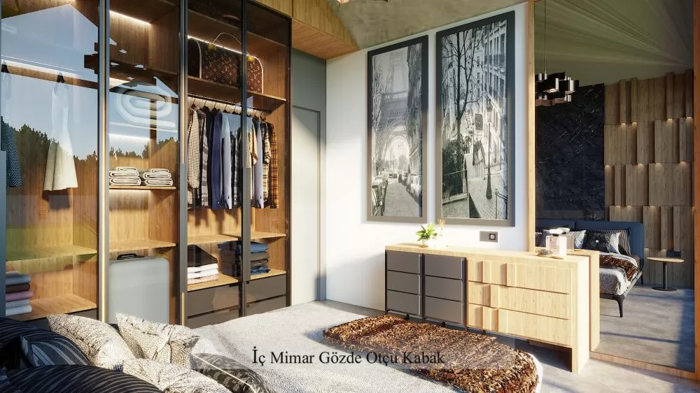 The theme of a rough stone continues in the Master bedroom interior as well. Masters’ block includes a bathroom, closet and the laundry room as well. The bathroom interiors are decorated with ceramic panels. Suspension light emphasizes the geometry of the space.