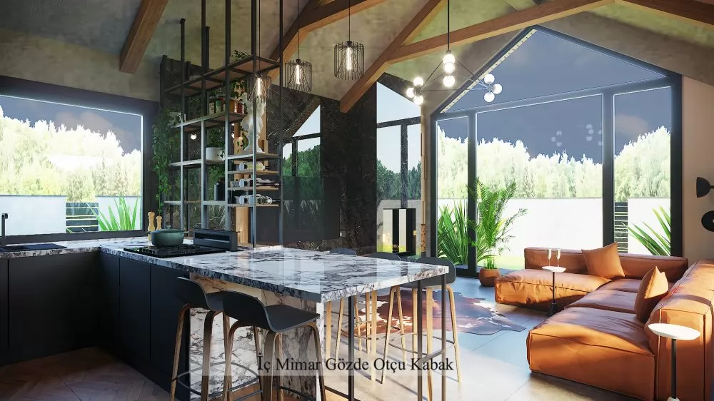 Related space of living room and a kitchen is decorated with granite slabs, decorative plaster and ceramic panels. It’s worth to mention the lighting system by “Flos” which is used for living room and kitchen areas. To leave open space we separated a stairs area with an interesting glass showcase with greenery inside. In the core of living rooms’ composition is “Budapest” sofa by “Baxter”.