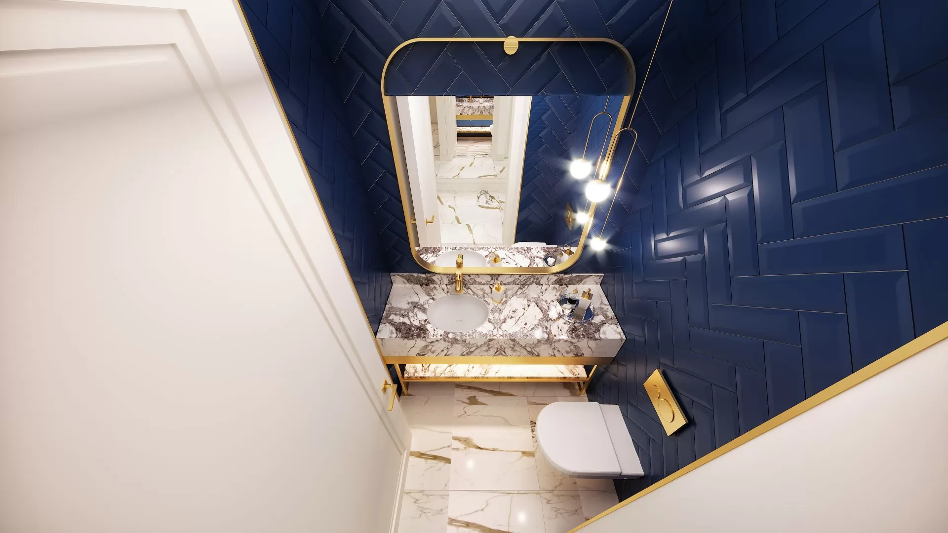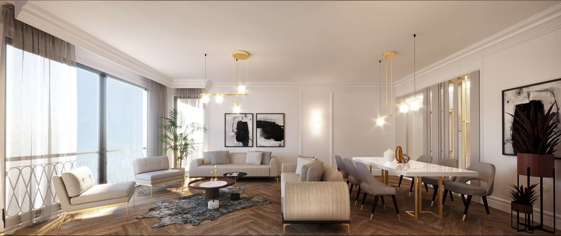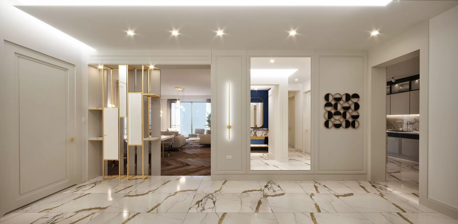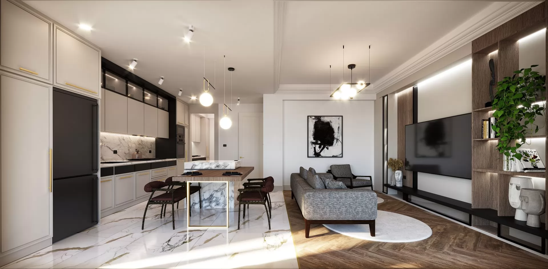 While choosing the kitchen finishes we gave our preference to the combination of the stylish steel facades with ceramics. An asymmetric composition of the kitchen modules give the space a spicy look. The dining area with the chairs by “Roche Bobois” is about to be used at friends parties as well as with cozy family dinners.