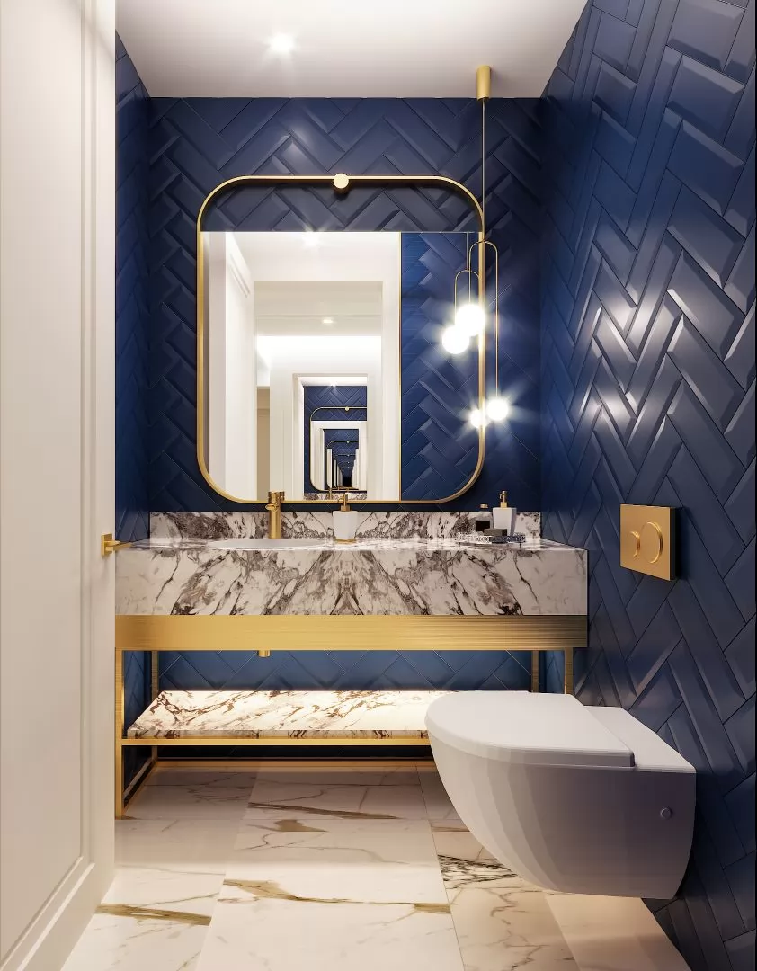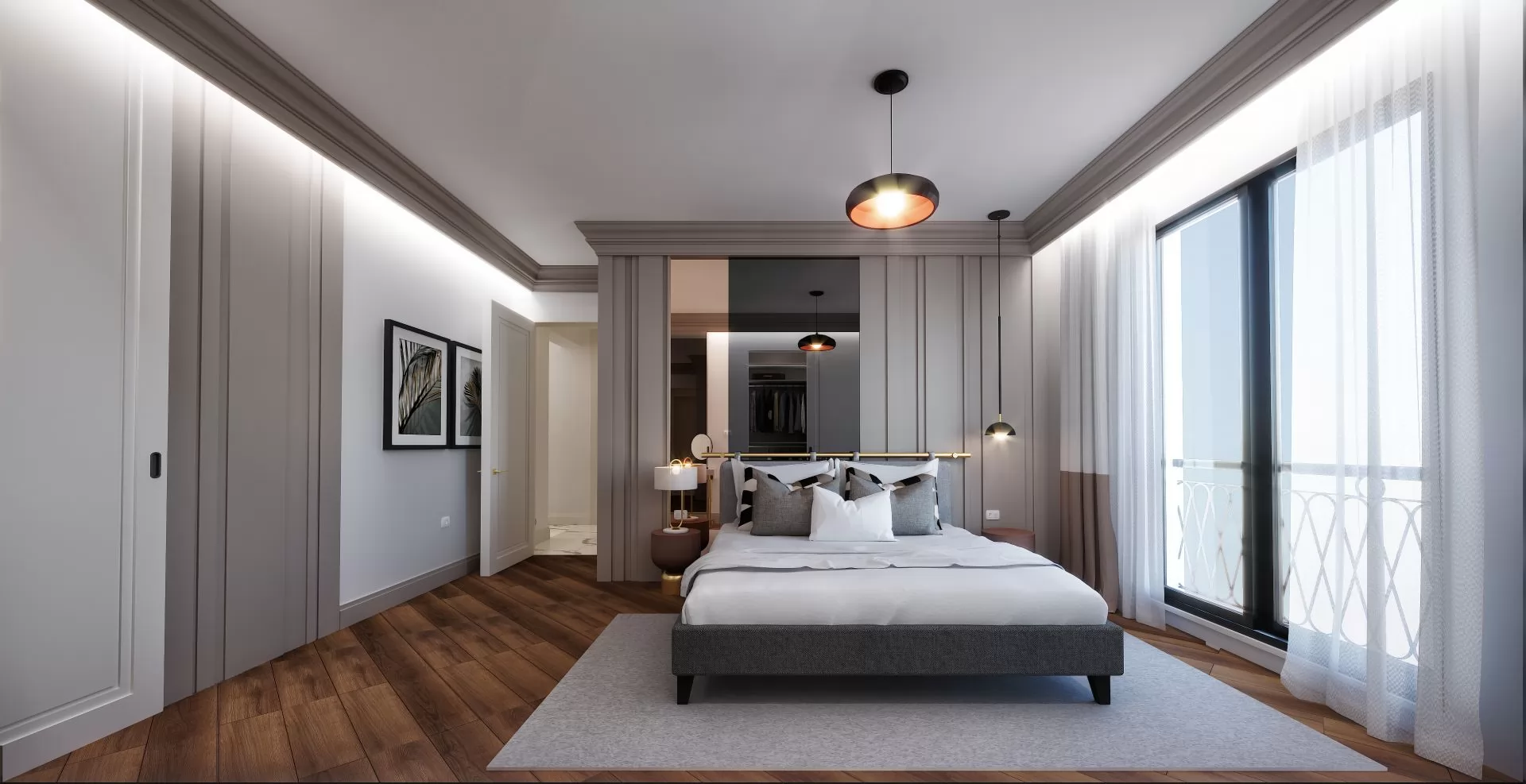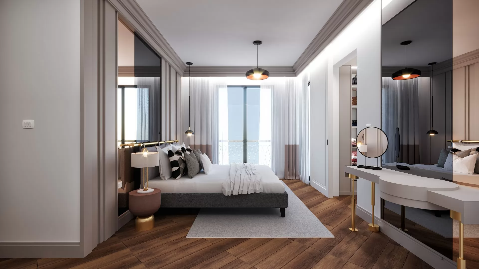 The theme of a rough stone continues in the Master bedroom interior as well. Masters’ block includes a bathroom, closet and the laundry room as well. The bathroom interiors are decorated with ceramic panels. Suspension light emphasizes the geometry of the space.