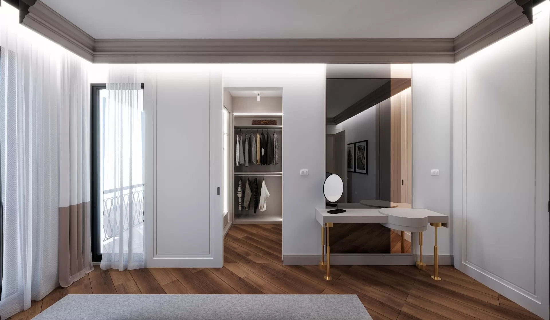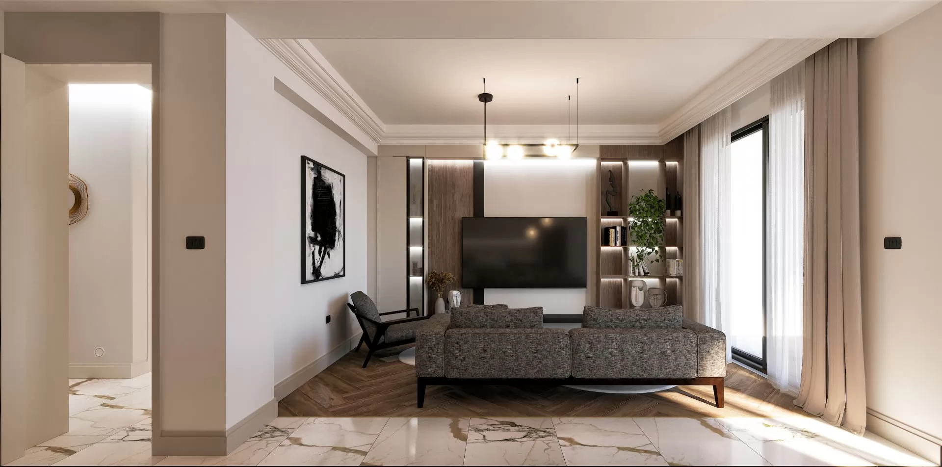 (description) The choice of minimalism style was obvious and we immediately started working with the project. A brutal monochrome color palette of shades of grey and reflects the owner’s character in the best way.