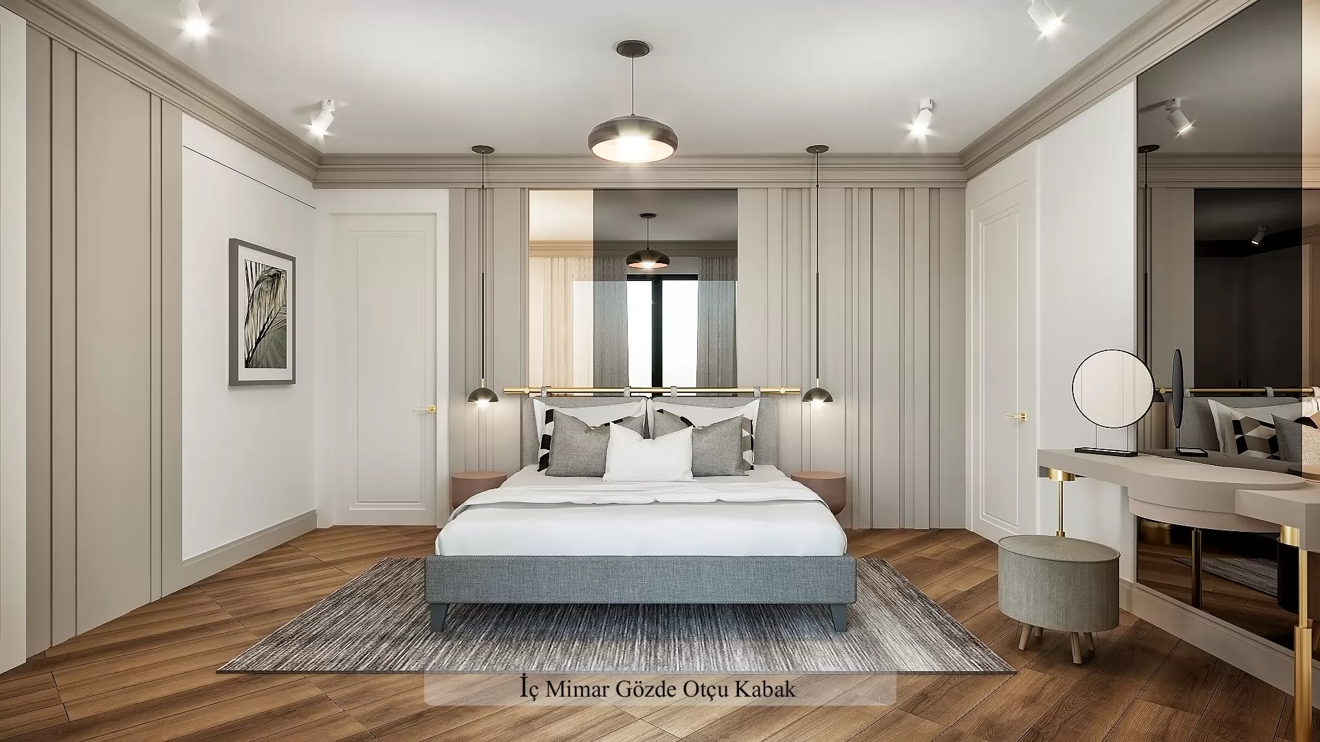 The theme of a rough stone continues in the Master bedroom interior as well. Masters’ block includes a bathroom, closet and the laundry room as well. The bathroom interiors are decorated with ceramic panels. Suspension light emphasizes the geometry of the space.