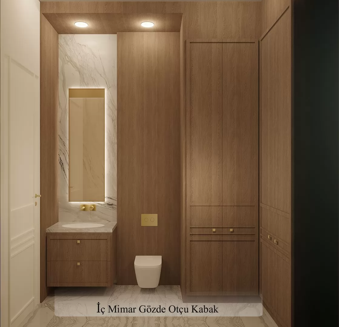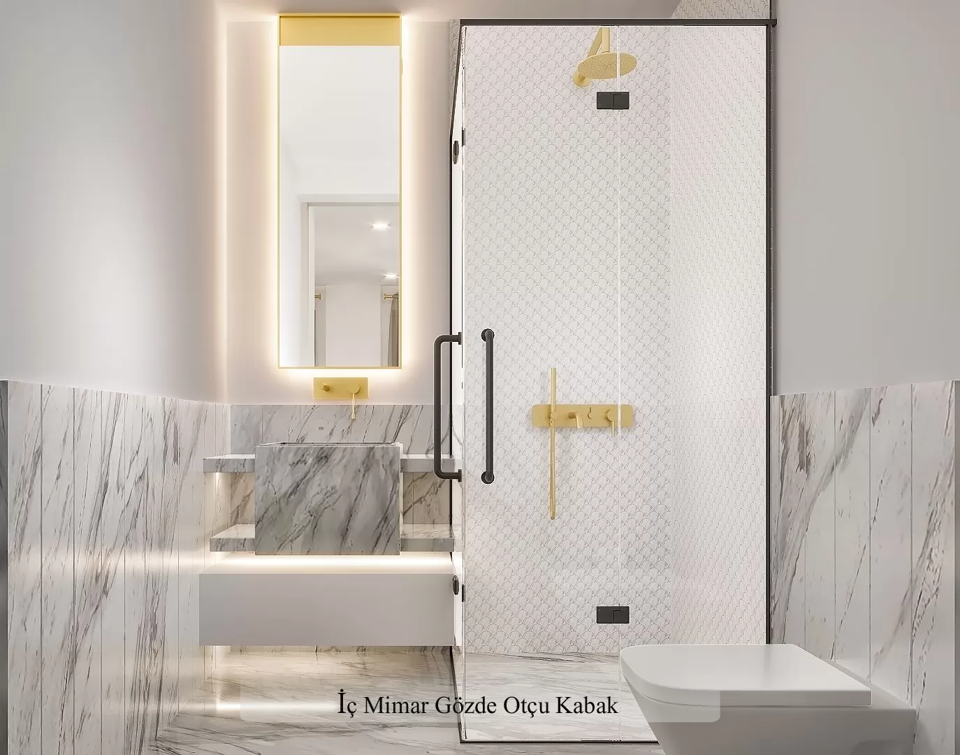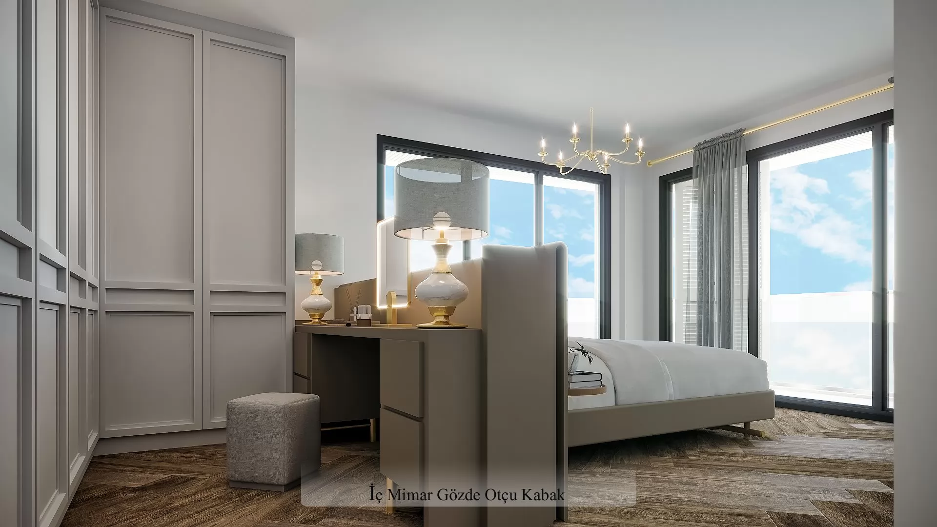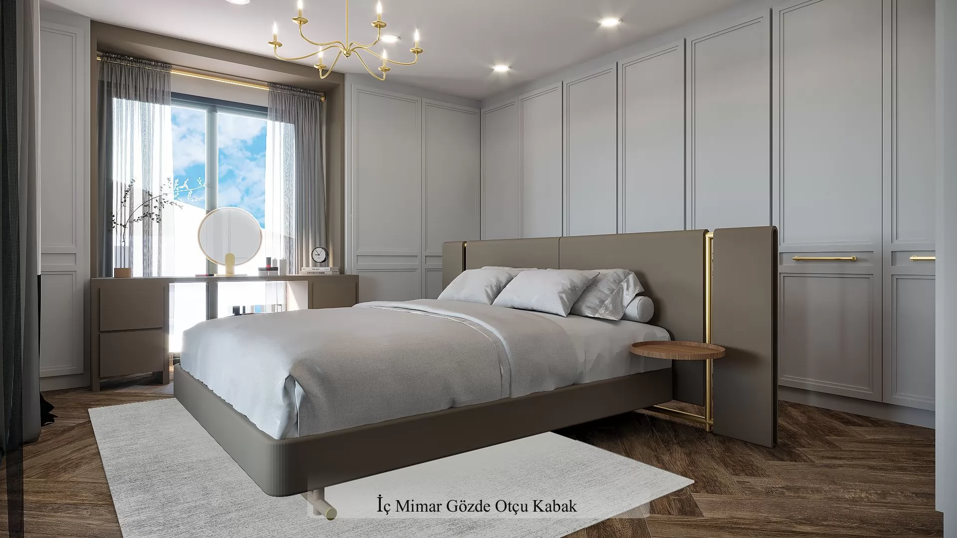 The theme of a rough stone continues in the Master bedroom interior as well. Masters’ block includes a bathroom, closet and the laundry room as well. The bathroom interiors are decorated with ceramic panels. Suspension light emphasizes the geometry of the space.