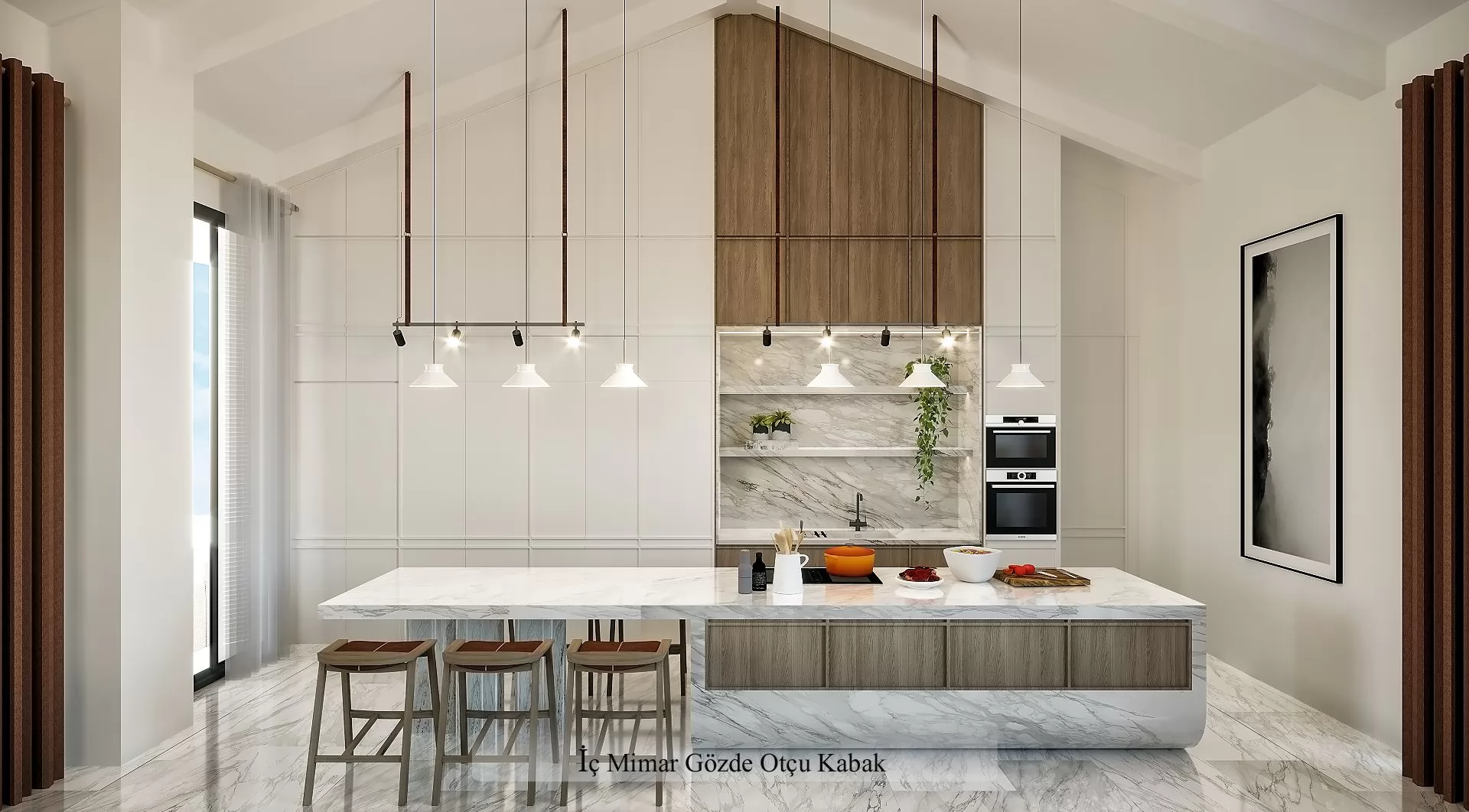 While choosing the kitchen finishes we gave our preference to the combination of the stylish steel facades with ceramics. An asymmetric composition of the kitchen modules give the space a spicy look. The dining area with the chairs by “Roche Bobois” is about to be used at friends parties as well as with cozy family dinners.