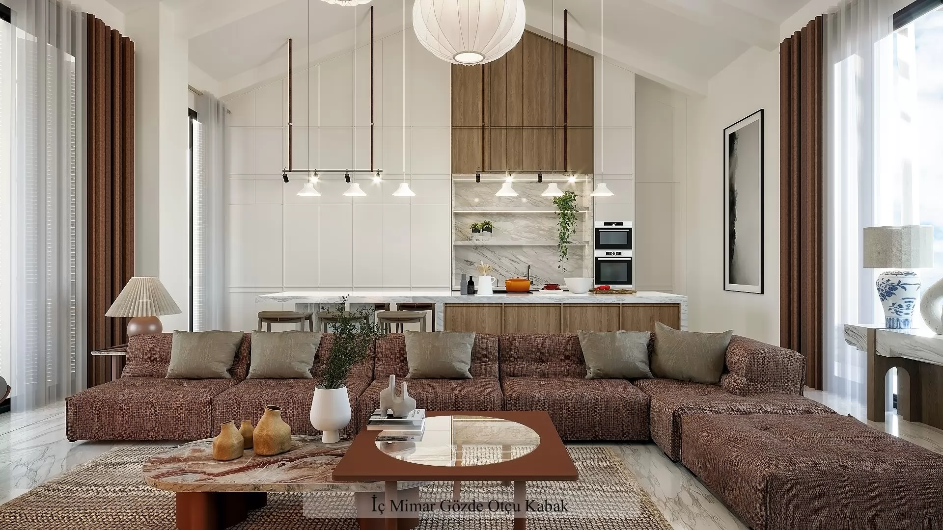 Related space of living room and a kitchen is decorated with granite slabs, decorative plaster and ceramic panels. It’s worth to mention the lighting system by “Flos” which is used for living room and kitchen areas. To leave open space we separated a stairs area with an interesting glass showcase with greenery inside. In the core of living rooms’ composition is “Budapest” sofa by “Baxter”.